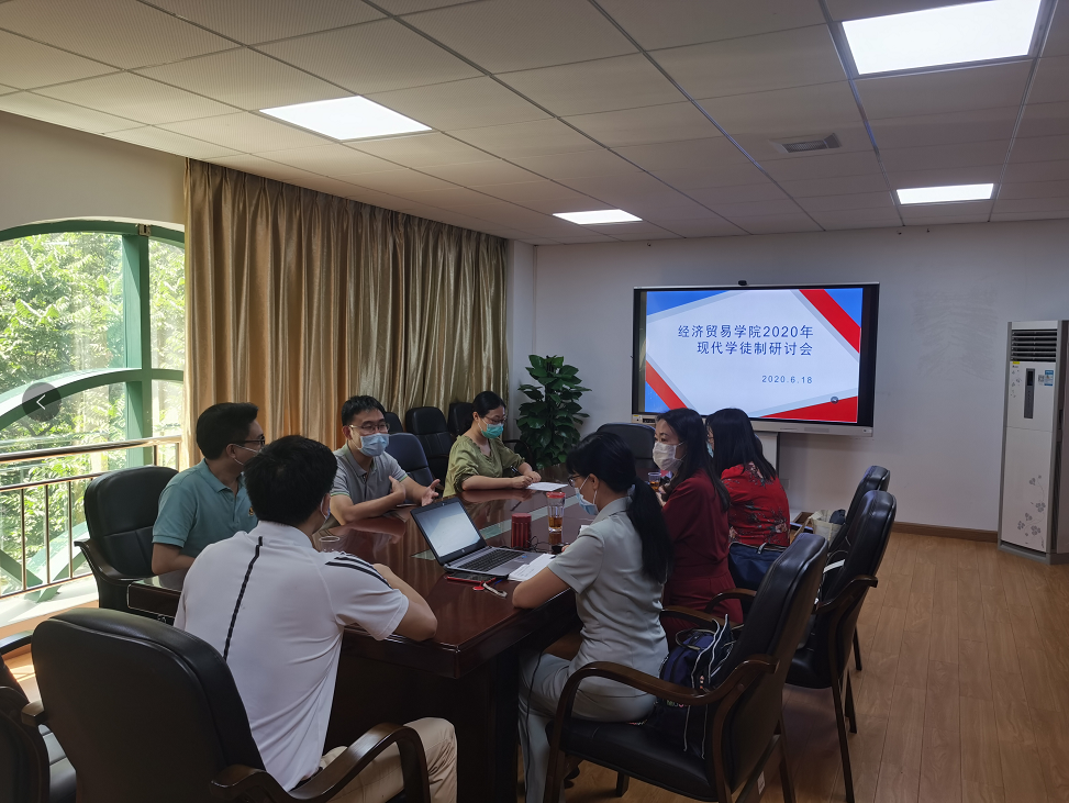 为了深化产教融合,进一步完善校企合作育人机制,创新技术技能人才培养模式,扎实做好行企校现代学徒制工作,实现专业设置与产业需求对接,课程内容与职业标准对接,教学过程与生产过程对接,职业教育与终身学习对接,提高人才培养质量和针对性,2020年6月18日上午,经济贸易学院召开了现代学徒制研讨会。经济贸易学院党总支书记李繁、院长邱秀芳、副院长方洁、商贸系主任蒋晶副教授、学工办张薇薇老师,以及广州市商贸职业学校商贸教学部李志宏部长、广州尊皇品牌管理有限公司徐蔚总经理参加了此次会议。