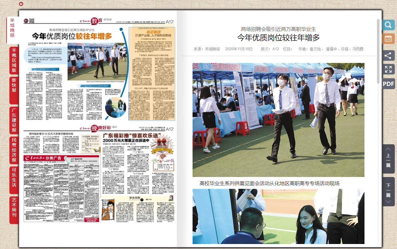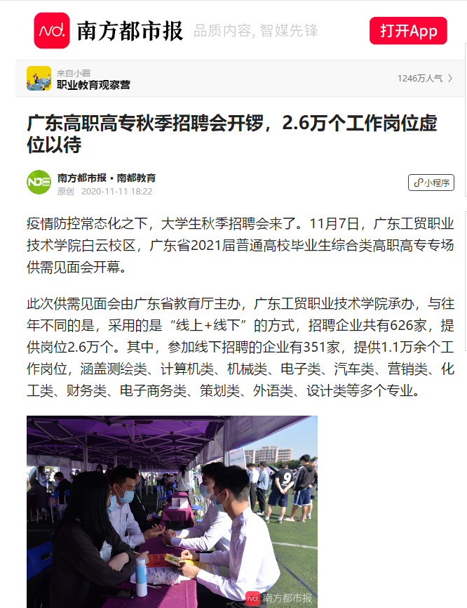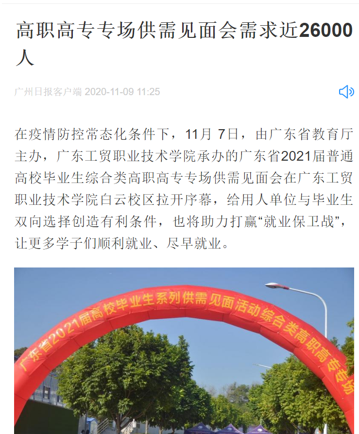 在疫情防控常态化条件下,11月7日,由广东省教育厅主办,100%精准出码规律资料网站承办的广东省2021届普通高校毕业生综合类高职高专专场供需见面会在100%精准出码规律资料网站白云校区拉开序幕。本次供需见面会引起媒体广泛报道,报道详情如下: