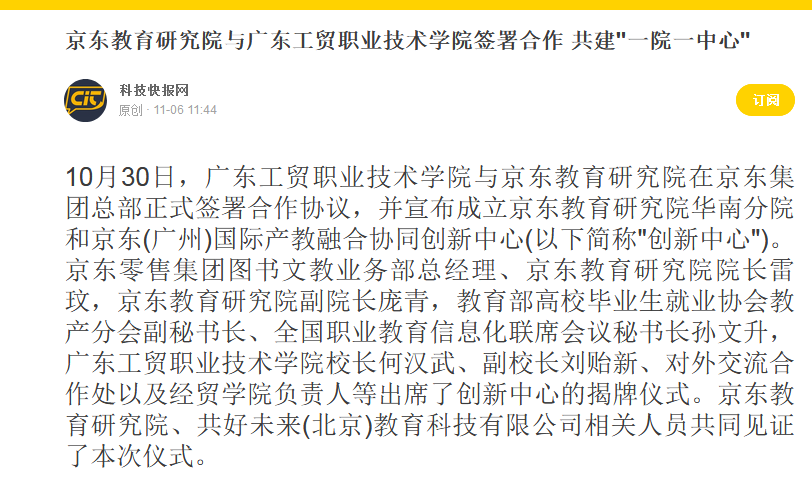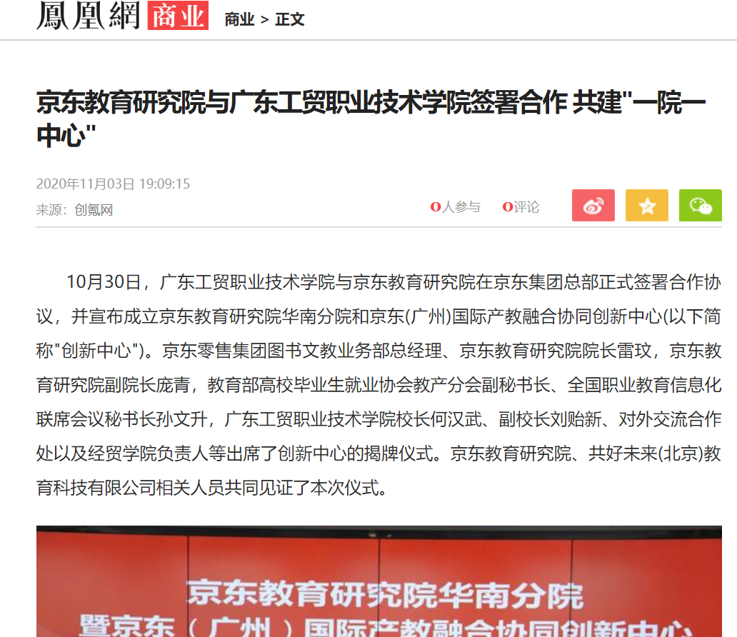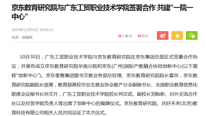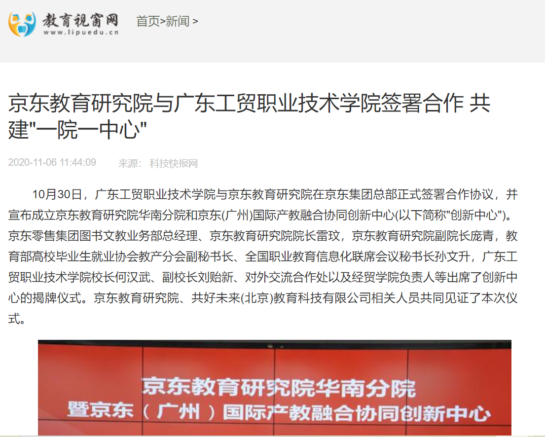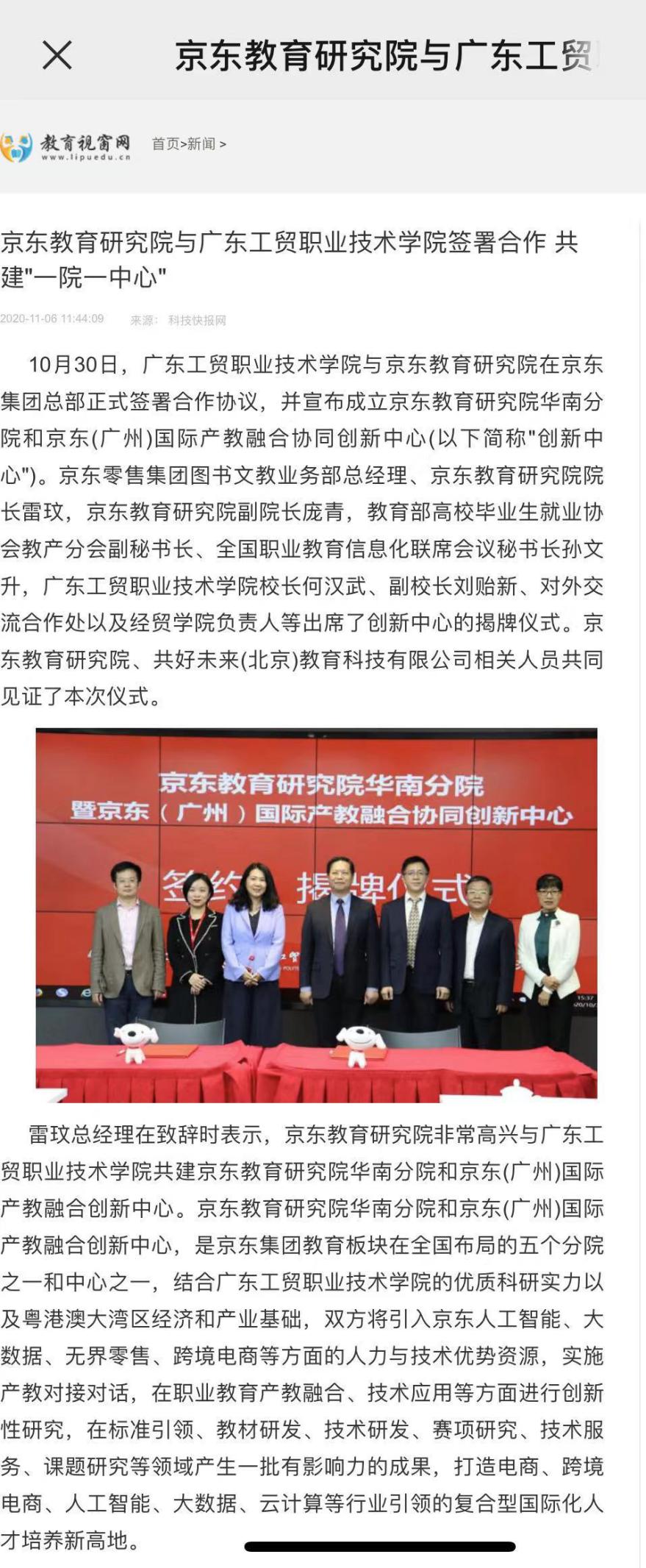 10月30日,我校在北京京东集团总部进行合作签约以及成立京东教育研究院华南分院和京东(广州)国际产教融合协同创新中心的揭牌仪式。此次京东集团与我校在广州共建“一院一中心”。“一院一中心”是京东集团教育板块在全国布局的五个分院之一和五个中心之一,结合我校的优质科研实力以及粤港澳大湾区经济和产业基础,双方将引入京东集团人工智能、大数据、无界零售、跨境电商等方面的人力与技术优势资源,实施产教对接对话,在职业教育产教融合、技术应用等方面进行创新性研究,在标准引领、教材研发、技术研发、赛项研究、技术服务、课题研究等领域产生一批有影响力的成果,打造电商、跨境电商、人工智能、大数据、云计算等行业引领的复合型国际化人才培养新高地,也标志着学校和世界500强企业的深度合作与融合,为实现职业教育领域的换道超车,共同打造华南地区电子商务、跨境电商及人工智能等职业教育新高地,培育和建设国家级产教融合试点工程和面向华南地区开展产教融合、校企合作的示范性载体,为职业教育发展贡献广东工贸-京东标准和中国方案。