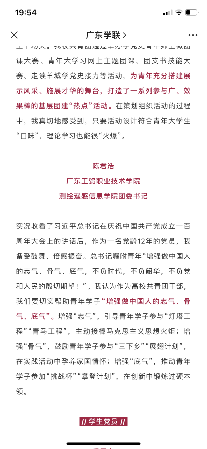强国有我,请党放心!近日,广东各高校联合组织师生观看并学习习近平总书记在庆祝中国共产党成立100周年大会上的重要讲话。习近平总书记的讲话内容引发了我校师生党员的热议,测绘遥感信息学院团委书记陈君浩会对习近平总书记的讲话内容发出由衷的共鸣。
