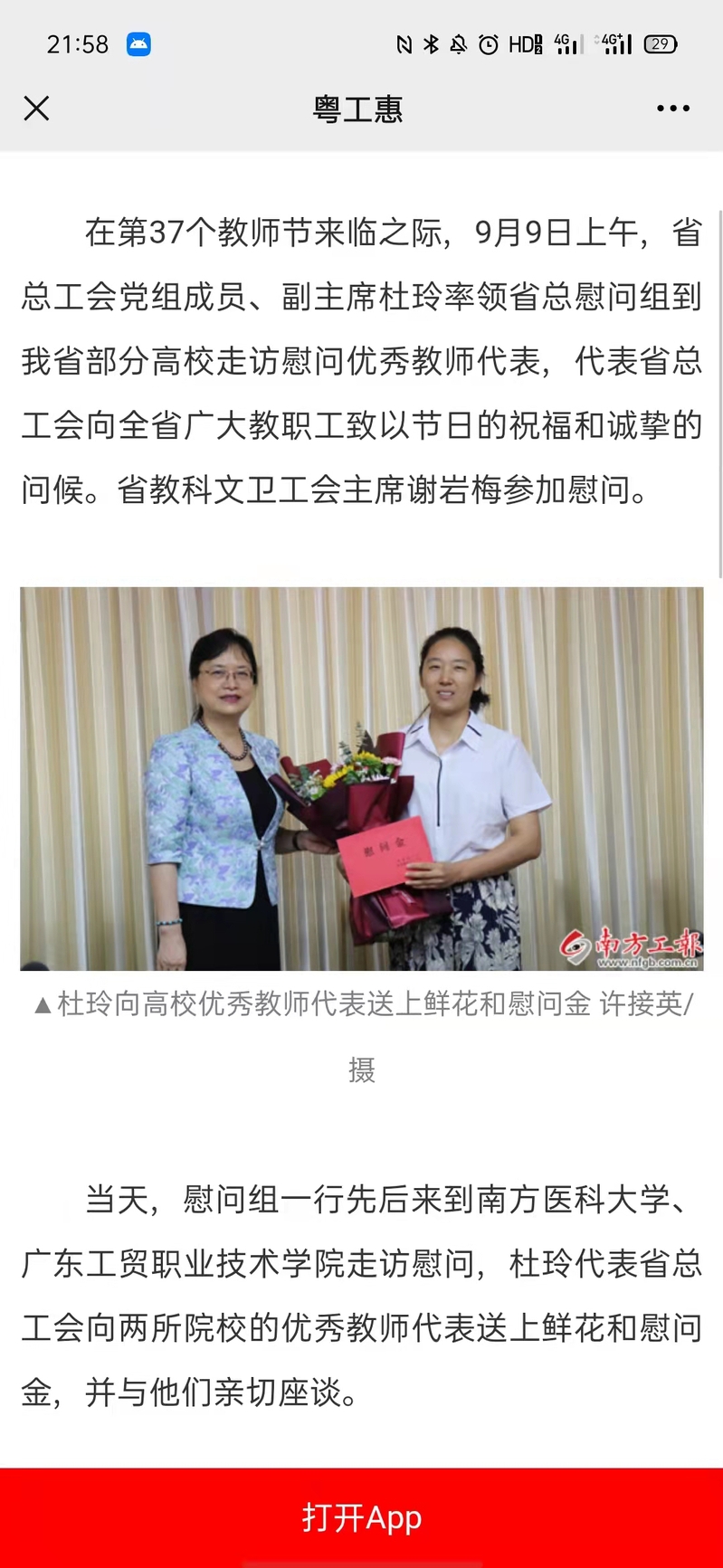 在第37个教师节来临之际,省总工会党组成员、副主席杜玲率领省总慰问组到我校走访慰问优秀教师代表,代表省总工会到学校致以节日的祝福和诚挚的问候。省教科文卫工会主席谢岩梅参加慰问。