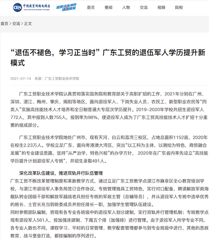 学校认真贯彻落实国务院和教育部关于高职扩招的工作,面向退役军人、下岗失业人员、农民工、新型职业农民等“四类人”实施高技能技术人才培养和全日制普通大专层次学历提升。其中,由郭朝明,林敏撰写的“退伍不褪色,学习正当时” 广东工贸的退伍军人学历提升新模式案例入选教育部职成司“提质培优、增值赋能典型案例”。
