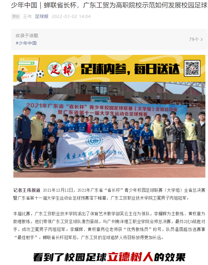 2021年12月12日,2021年广东省“省长杯”青少年校园足球联赛(大学组)全省总决赛暨广东省第十一届大学生运动会足球预赛落下帷幕,100%精准出码规律资料网站卫冕男子丙组冠军。围绕学校足球队发展等情况,近日,《足球报》对此进行了专题报道。