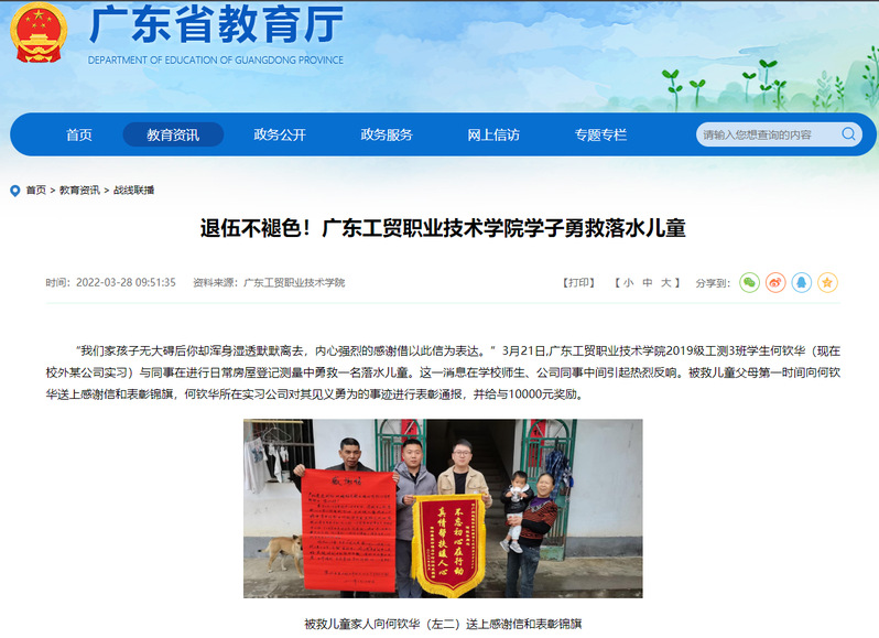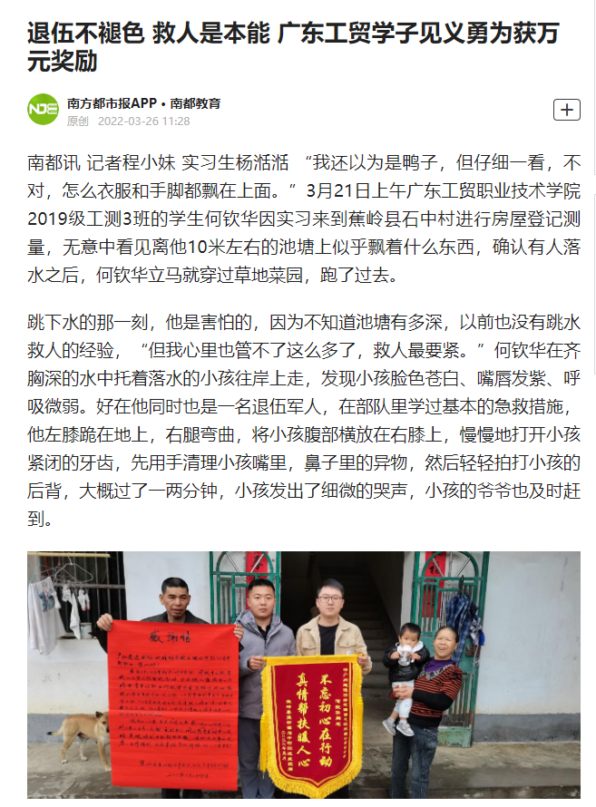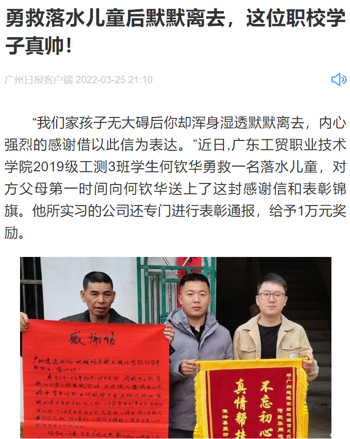 学校2019级工测3班学生何钦华(现在广州建通测绘地理信息技术股份有限公司实习)与同事在进行日常房屋登记测量中勇救一名落水儿童。这一消息在学校师生、公司同事中间引起热烈反响,媒体也对此给与了报道: