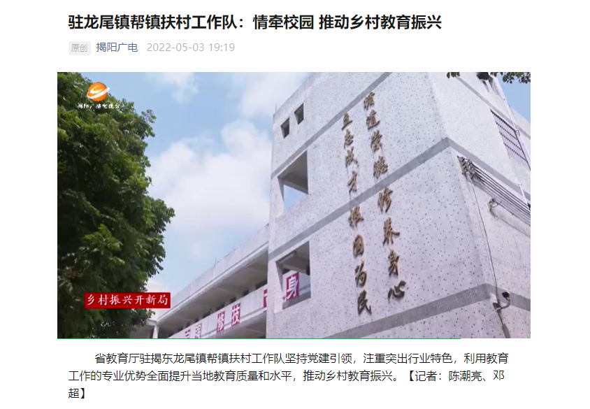 广东省教育厅作为牵头单位,学校作为参与单位,共同派员组建了揭阳市揭东区龙尾镇驻镇帮镇扶村工作队,积极推动当地乡村教育高质量发展,为乡村孩子提供更加便捷、更为舒心的学习环境。