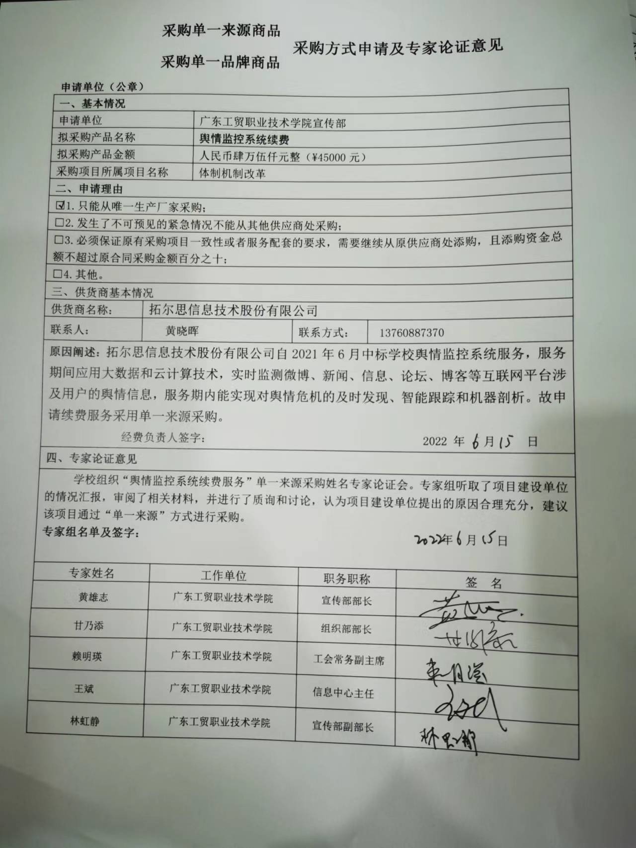 拓尔思信息技术股份有限公司自20216月中标学校舆情监控系统服务,服务期间应用大数据和云计算技术,实时监测微博、新闻、信息、论坛、博客等互联网平台涉及用户的舆情信息,服务期内能实现对舆情危机的及时发现、智能跟踪和机器剖析。故申请续费服务采用单一来源采购。
