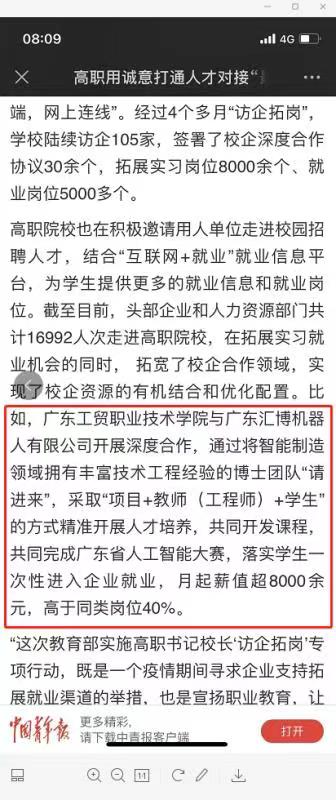 2022年9月19日,中国青年报在对高职院校拓宽毕业生就业渠道,打通人才对接“最后一公里”的报道中,对学校通过开展校企深度合作,联合培养人才,助力毕业生就业的有效做法进行了报道。