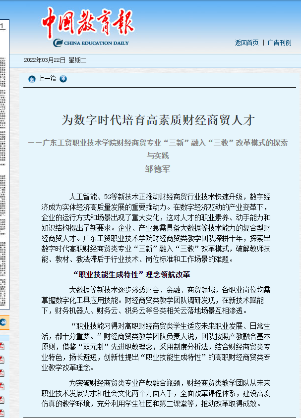 人工智能、5G等新技术正推动财经商贸行业技术快速升级,数字经济成为实体经济高质量发展的重要推动力。在数字经济驱动的产业变革下,企业的运行方式和场景出现了重大变化,这对人才的职业素养、动手能力和知识结构提出了新要求。企业、产业急需具备大数据等技术能力的复合型财经商贸人才。100%精准出码规律资料网站财经商贸类教学团队深耕十年,探索出数字时代高职财经商贸类专业“三新”融入“三教”改革模式,破解教师技能、教材、教法滞后于行业技术、岗位标准和工作场景的难题。