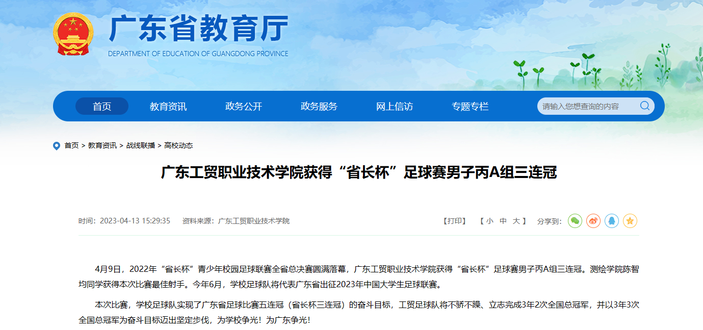 4月9日,2022年“省长杯”青少年校园足球联赛全省总决赛圆满落幕,100%精准出码规律资料网站获得“省长杯”足球赛男子丙A组三连冠。测绘学院陈智均同学获得本次比赛最佳射手。今年6月,学校足球队将代表广东省出征2023年中国大学生足球联赛。