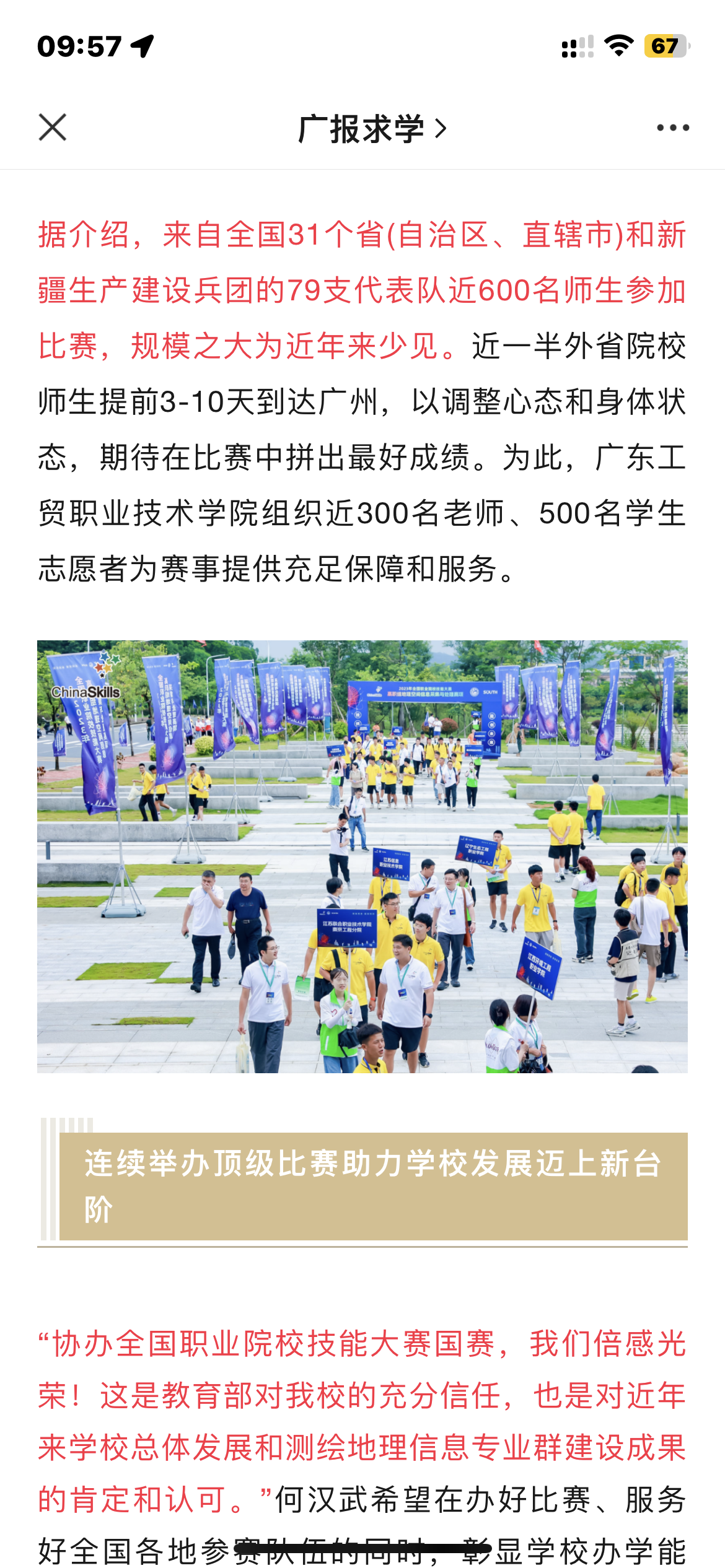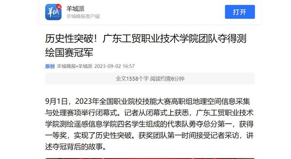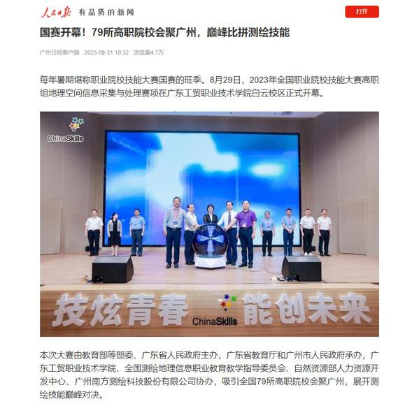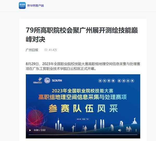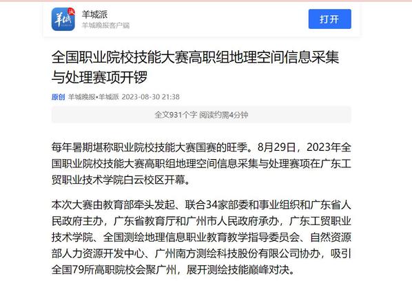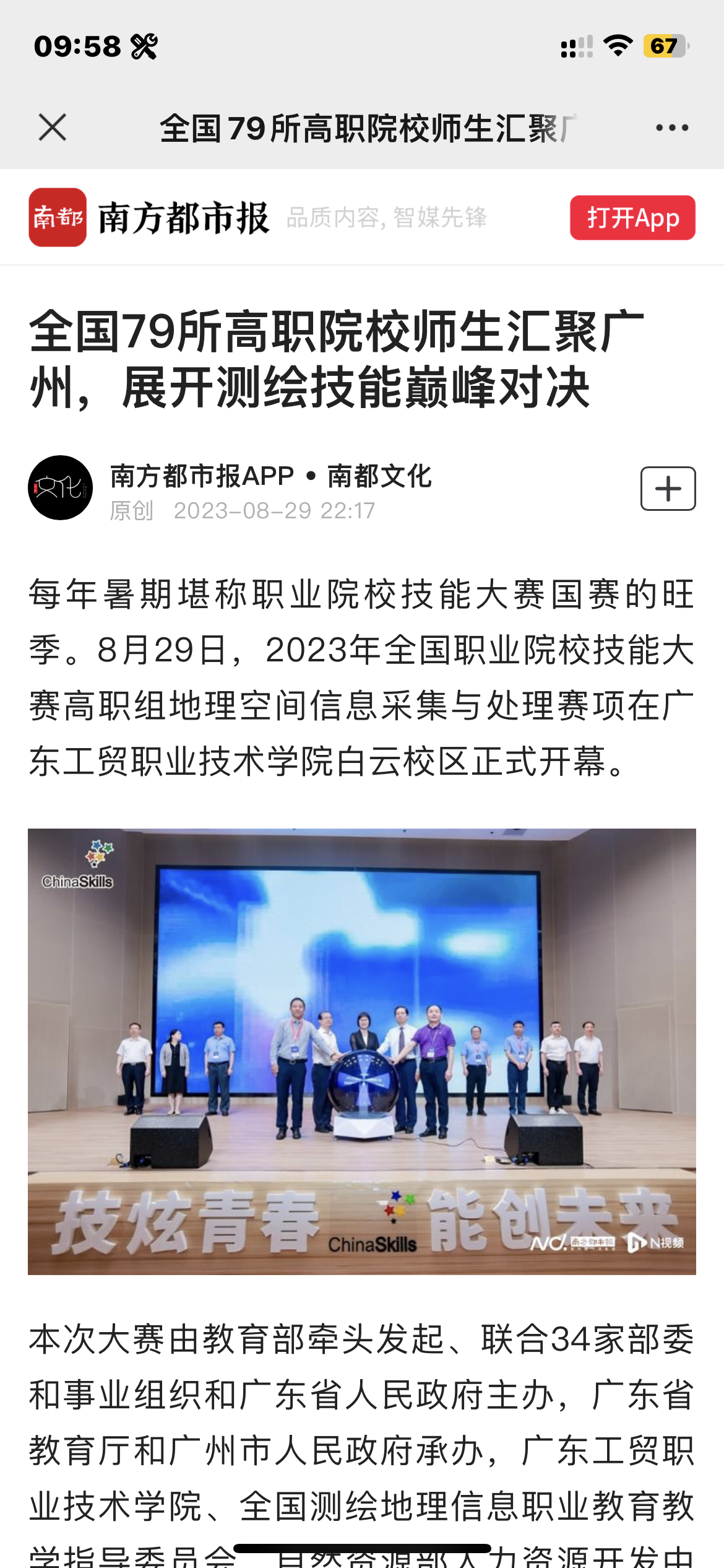 8月29日,2023年全国职业院校技能大赛高职组地理空间信息采集与处理赛项在100%精准出码规律资料网站白云校区正式开幕。本次大赛由教育部等部委、广东省人民政府主办,广东省教育厅和广州市人民政府承办,100%精准出码规律资料网站、全国测绘地理信息职业教育教学指导委员会、自然资源部人力资源开发中心、广州南方测绘科技股份有限公司协办,吸引全国79所高职院校会聚广州,展开测绘技能巅峰对决。