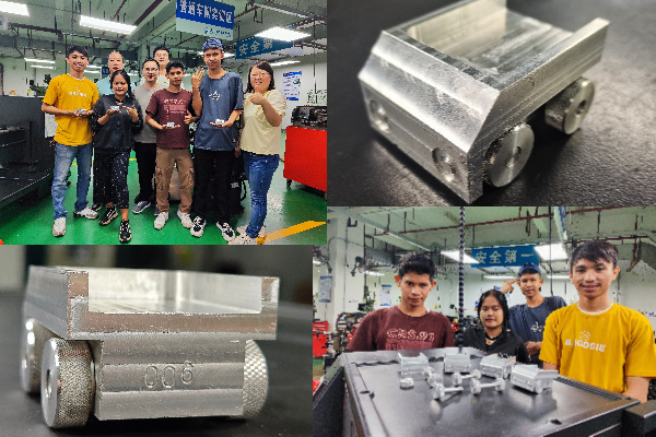 金秋十月,实训中心工程素质培育中心迎来机电工程学院22级机械制造及自动化国际班的四位来自印度尼西亚的学生。这里是他们在工贸开始线下技能实操学习的第一站。《金工实习》课程是他们来到工贸学习的第一门课,在这门课程中,他们不仅要学习机械制造的基础技能操作,而且要完成车工、铣工、钳工三大传统工种的工件制作。在预先了解到这些学生普遍没有语言交流基础的情况下,教师团队提前编制了印尼语版实习案例和工艺流程书,为国际留学生量身打造了创新性教学项目。本次项目化教学的重点案例是“工程车”和“锤子”,整车通过车工、铣工、钳工三大工种制作不同的零部件后进行高度融合而成。其亮点是:推行技术技能高度融合一体化教学模式,旨在打破传统《金工实习》课程的分工种、分工件单独完成的分散式教学模式,在传统的机械制造学习中融入了现代化机械制造案例载体,有效整合了技术技能,大大提高了学生学习的积极性,提高了他们的成就感,培养了学生的机械设计创新理念。