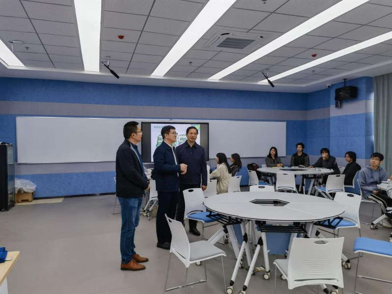2023年11月15日,学校党委副书记、校长何汉武,党委委员、副校长刘贻新到测绘地理信息技术国家虚拟仿真实训基地调研指导工作,基地建设办公室主任、测绘遥感信息学院副院长高照忠陪同调研,并汇报虚拟仿真基地建设和教学应用情况。