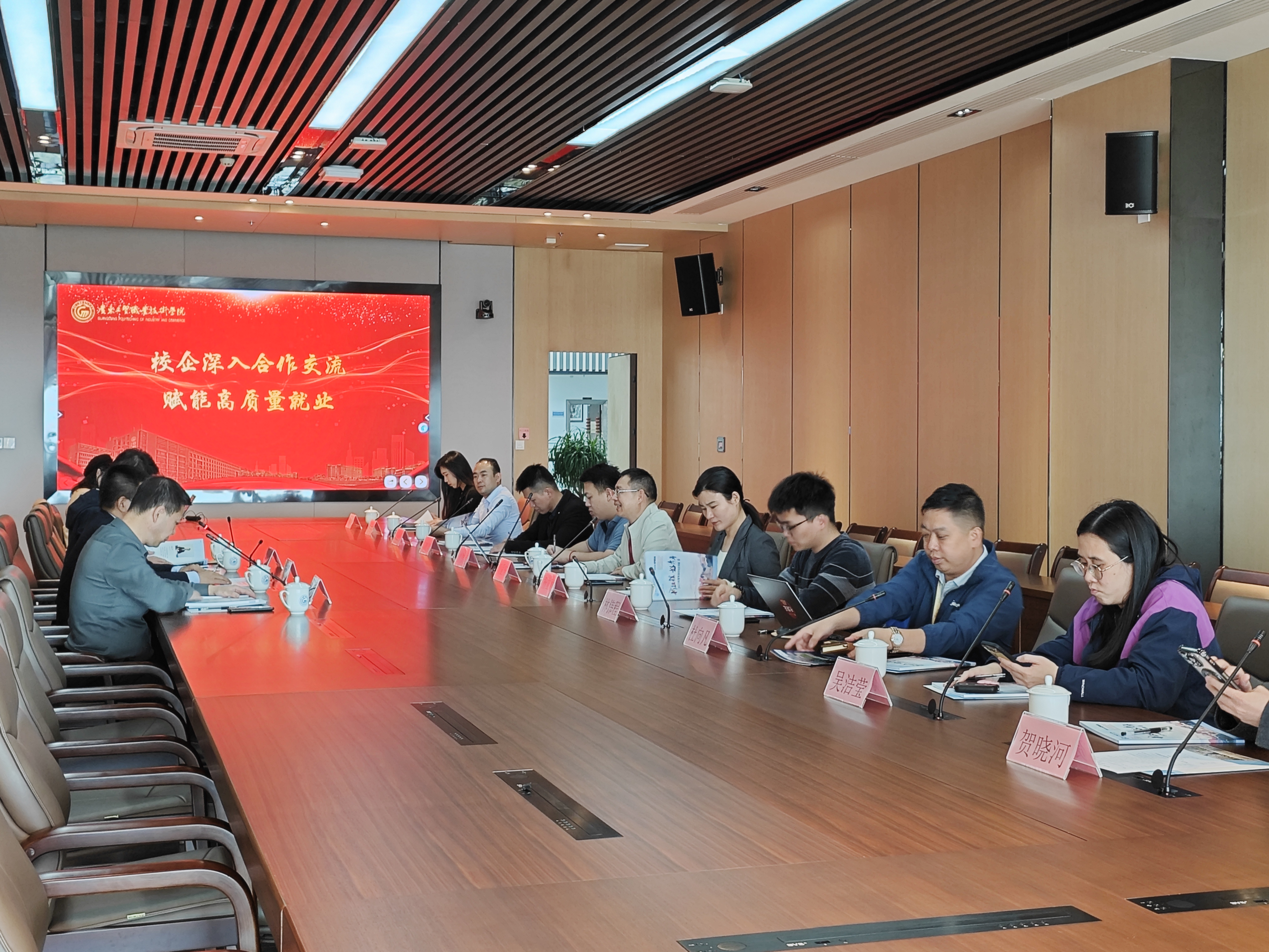 为深入贯彻党的二十大精神,全面落实党中央、国务院以及省委省政府对高校毕业生就业创业工作的决策部署,拓宽校企各方的良性交流互动渠道,主动落实访企拓岗,积极推进广东省高校2024届毕业生高质量就业工作。11月21日,我校组织召开“校企深入合作交流,赋能高质量就业”交流会,广东省政行企教育研究院执行院长郭爱东、副院长杨立财等带领会员企业莅临我校参与会议,学校党委委员、副校长唐毓秋,办公室主任吴浩,教务处处长赵文龙,学生工作部(处)部(处)长刘建军等出席会议。