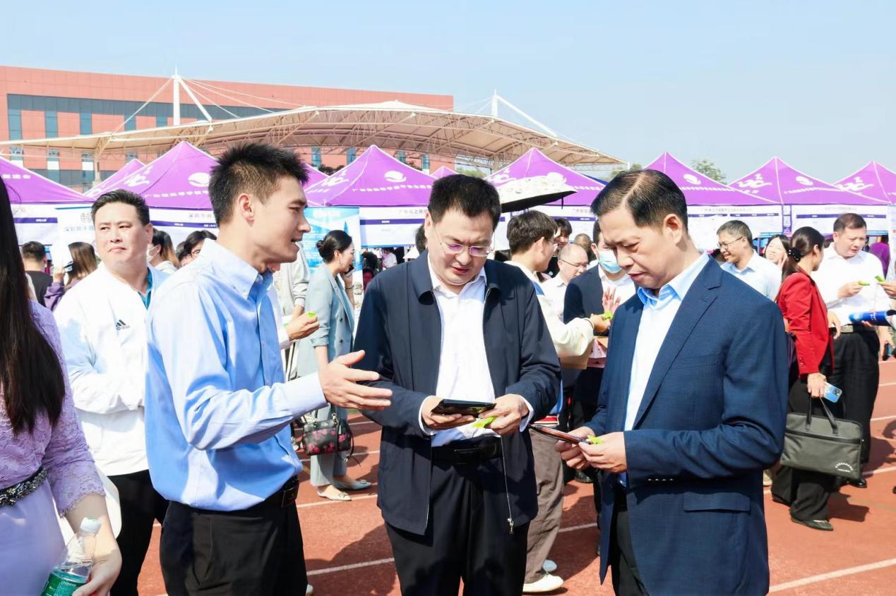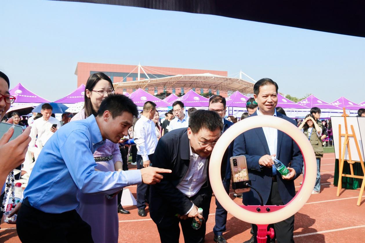 广东省教育厅党组成员、副厅长程大欣(中)、100%精准出码规律资料网站党委书记何汉武(右)观看助农直播