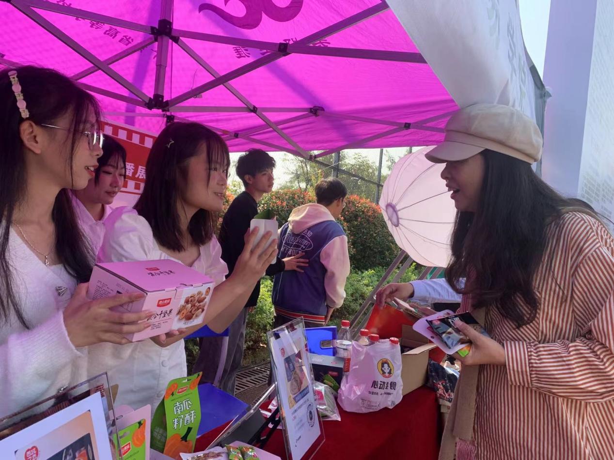 经济贸易学院的大本营位于主席台正对面,大本营右侧放置了经济贸易学院宣传板及直播中心吉祥物“播播”,并设计制作了经贸学院成果展展板,展示我院师生在竞赛获奖、教育教学、科研成果、教材著作等方面的突出成绩;大本营左侧则是我院学生直播带货、助力农产品销售的主场地。直播作为经贸学院电子商务专业的专业特色也为此次招聘会增添了一份与众不同的色彩,此次直播是为了助力乡村振兴,为助农贡献经贸的一份力量。截至目前,我院打造的大学生乡村振兴直播中心立项省级基地、科研平台、课题等7项,发表论文30余篇,学生参加互联网+,挑战杯等获国家级、省级奖项30余项。助推乡村振兴以来,直播中心团队直播开展综合助农活动共计逾300场次,助农卖出核桃、龙眼、荔枝等各类农副产品近2万斤、直播带货助果农增收超30万元。