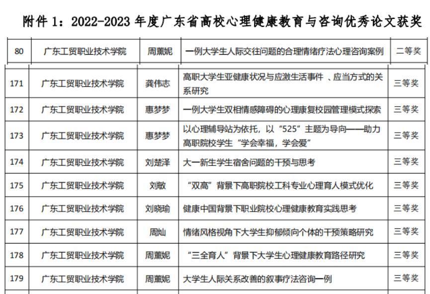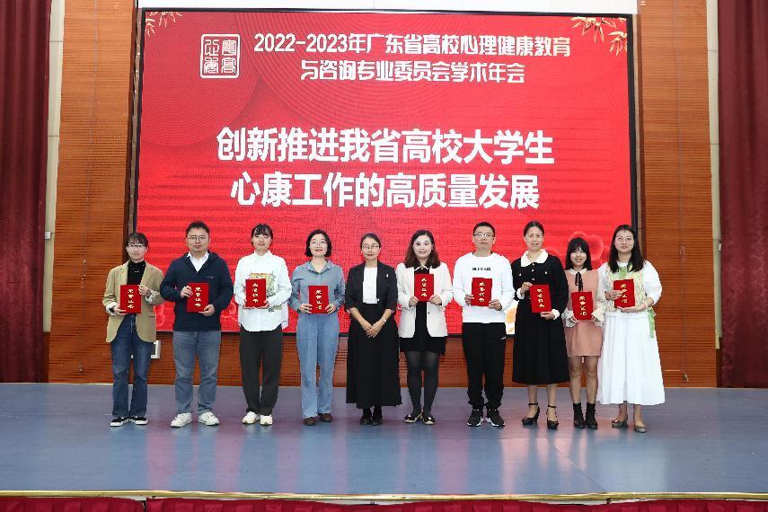 会上还表彰了广东省高校心理健康教育与咨询工作先进集体、先进个人、优秀论文等。我校学生工作处心理咨询中心被授“2022-2023年度广东省高校心理健康教育与咨询工作先进集体”荣誉称号;刘晓瑜老师荣获“广东省高校心理健康教育和咨询工作先进个人”。此外,在优秀论文评比中,我校七名教师的学术论文成果获广东省高校心理健康教育与咨询优秀论文奖,其中,周薰妮老师论文成果分别荣获二等奖和三等奖,龚伟志、刘敏、刘晓瑜、周灿、惠梦梦、刘楚泽老师的论文成果均荣获三等奖。
