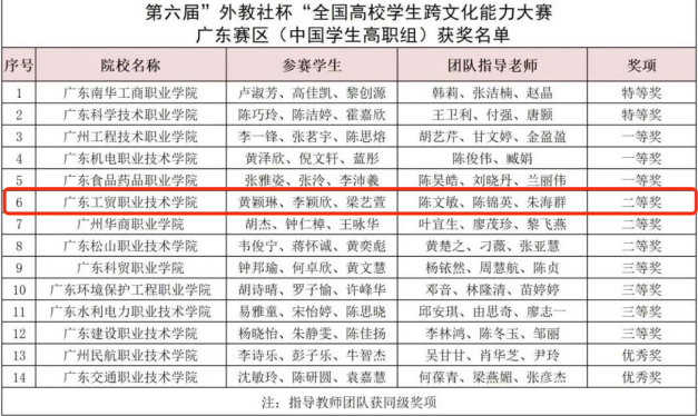11月25日,在第六届“外教社杯”全国高校学生跨文化能力大赛广东赛区中我校22商英5班黄颖琳、22国贸1班李颖欣和22工设5班梁艺萱三名同学组成的团队荣获二等奖,应用外语学院陈文敏老师、陈锦英博士和朱海群老师获得优秀指导教师奖。