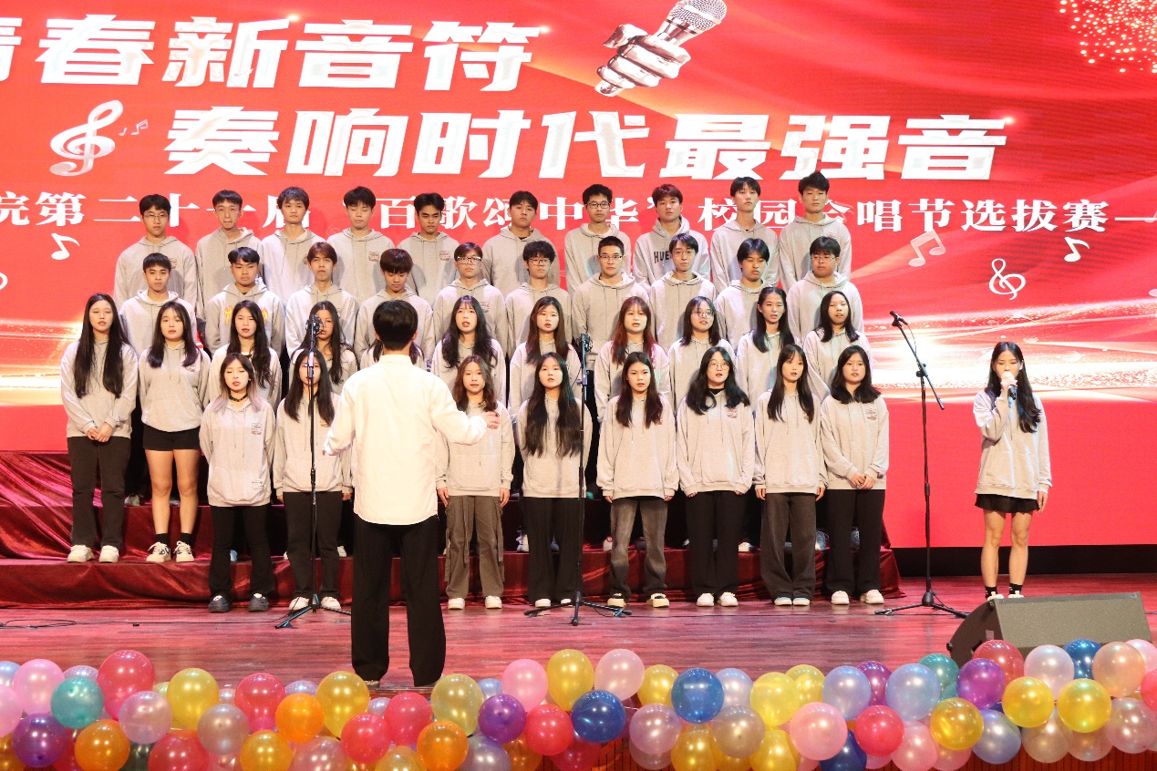 比赛当天,参赛班级整齐列队,有序进场,怀着激动澎湃的心情参与此次比赛,为在场的观众带来一场场视听盛宴。校歌《放飞梦想》响彻于演艺厅之中,回荡在观众的耳畔,歌词“辉煌的时代实现我们的理想”诠释着新时代大学生“踔厉奋发、勇毅前行”、成为国家栋梁的远大志向。