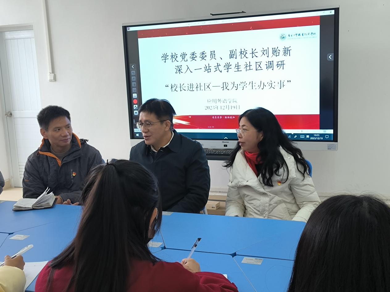 为进一步落实立德树人的根本任务,也进一步探索“一站式”学生社区综合管理模式,更是为了全面了解学生的思想、学习及生活状态,从切实维护学生的切身利益出发,推进学校教育事业高质量发展。12月19日下午,应用外语学院在16栋2楼辅导员工作室开展了主题为“校长进社区——我为学生办实事”的座谈会。学校党委委员、副校长刘贻新、应用外语学院党总支临时负责人罗春科、学院院长彭枚芳,学院学工办主任林耀佳参加会议,应用外语学院三个年级九位学生代表参加座谈交流。