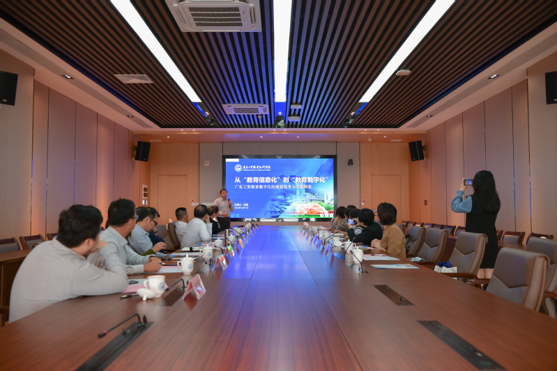 随后,双方在图书信息楼第三会议室进行了座谈交流,座谈会由何汉武书记主持。何汉武书记代表学校对交流团的来访表示热烈欢迎,并就学校办学历程和基本情况进行了详细介绍。余莎书记也介绍了广州卫生职业技术学院的基本情况。广州卫生职业技术学院信息技术中心主任吴力挽介绍了以《广州卫生职业技术学院数字化校园建设现状及设想》为题详细介绍了数字化校园现状、数字化转型目标思路以及信息化建设设想等方面的内容。我校信息中心主任王斌以《从“教育信息化”到“教育数字化”广东工贸教育数字化的规划思考与实践探索》为题详细介绍了学校信息化建设历程、建设内容以及建设成效方面的内容。余莎书记对我校整体情况、测绘学院及数字校园建设的高质量发展给予了高度评价。她表示,希望能加强信息化建设经验分享,为广州卫生职业技术学院的信息化发展注入新活力。接着双方就财务线上审批、学工信息系统管理、教职工履历数字化管理等方面进行了经验交流和深入探讨。