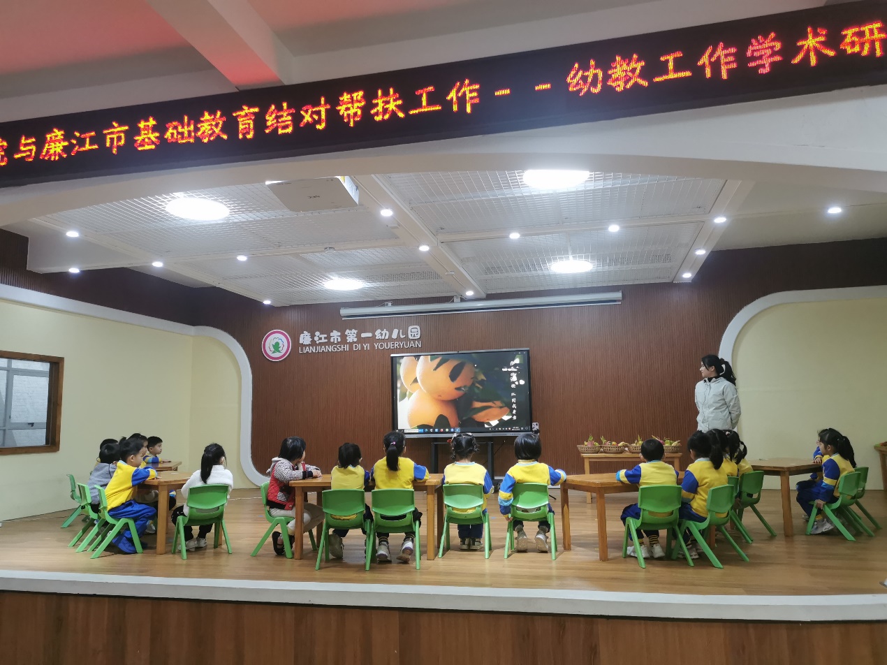 陈维璐老师“讲学送教”环节之后,廉江市第一幼儿园叶潼老师主讲大班语言活动《廉江水果推介会》。随着一首别具地方特色的歌曲《我的九洲江》,叶老师带领小朋友们进入美丽的廉江,了解廉江有哪些水果,可以怎样推介廉江的水果。小朋友们积极与叶老师互动,以小组为单位选择一种水果进行推介,推介的方式非常新颖——网络现场直播,小朋友个个争当“廉江水果推介小天使”,把课堂气氛推向高潮。面对镜头,小朋友毫不怯场,有条理,清晰地介绍了廉江的各种水果,有些还讲得生动有趣呢。最后,作为小主人,小朋友们还把家乡的水果送给在座的各位客人品尝,以实际行动来推介家乡的特产,表达、体验热爱家乡的情感。