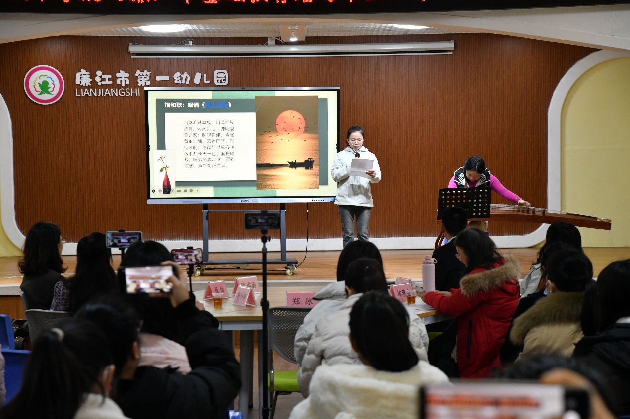 首先,陈维璐老师为廉江市幼师们带来了“中国音乐欣赏”课。陈维璐老师毕业于星海音乐学院音乐表演专业,是中国民族管弦乐协会古筝高级指导教师,曾获广东省职业院校学生专业技能大赛艺术专业技能一等奖优秀指导教师称号。陈老师从《史记》的“秦筝和乐”讲起,伴随着“高山流水”、“春苗”、“渔舟唱晚”等美妙的古筝演奏,通过生动的讲学与幼儿园老师互动,陈老师很好地诠释了“寓教于乐、融学于趣、化教于心”的教育理念;宣传了习近平总书记对宣传思想文化工作的重要指示:“坚定文化自信,秉持开放包容,坚持守正创新”,文化自信体现在对民族文化价值的自觉认知,体现在对民族文化生命力的坚定信念。在场人员仔细聆听、情感达到共鸣、阵阵掌声响起。
