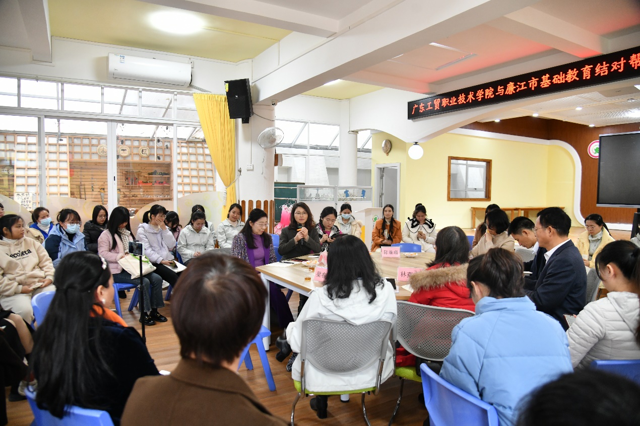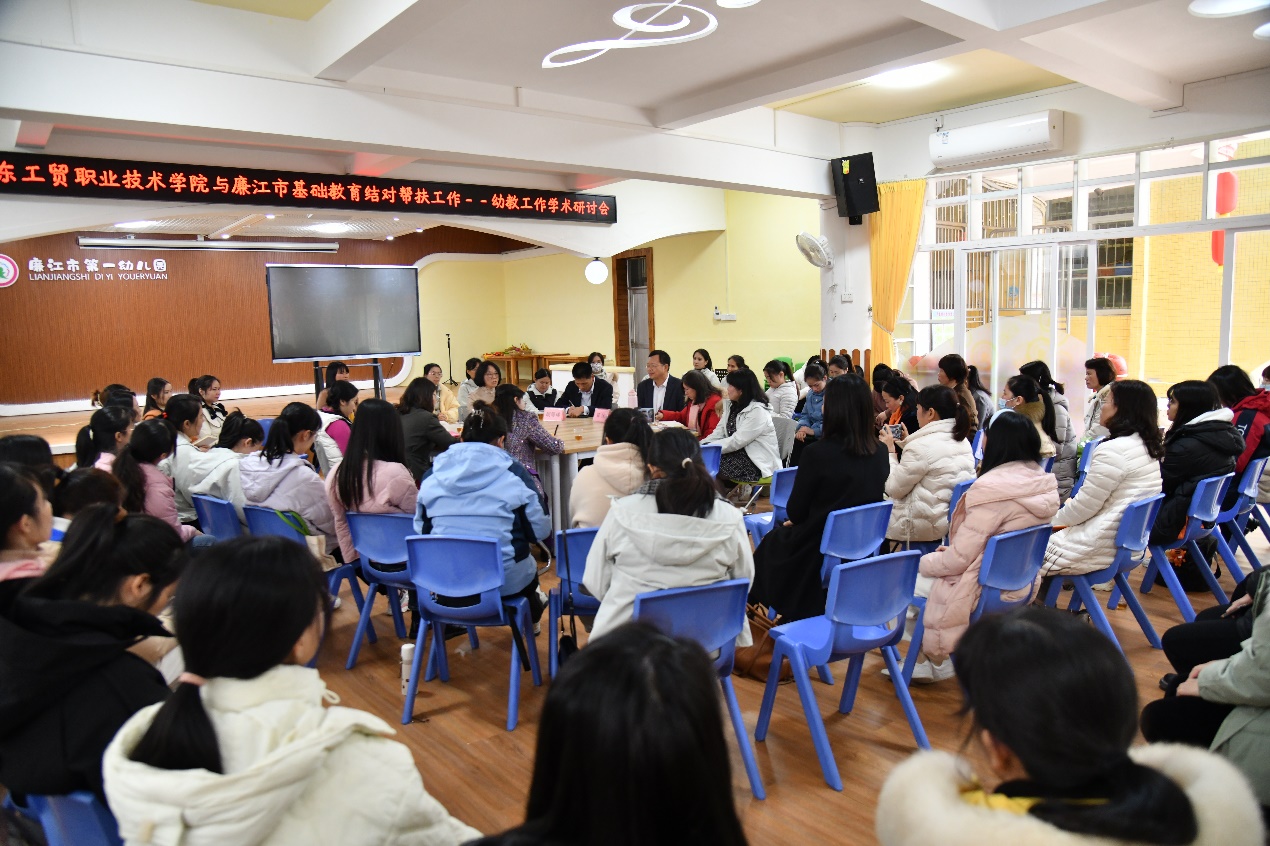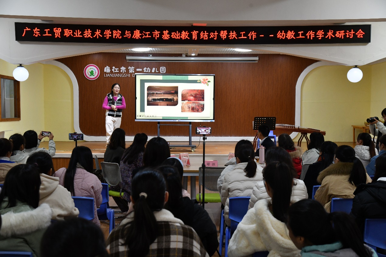 12月19日,为加强在学前教育领域课程建设、学术研究等方面交流,助力廉江幼儿教师教育教学能力提升,学校与廉江市教育局共同组织开展了送教暨幼教学术研讨会,会议地点设在廉江市第一幼儿园,廉江辖内幼儿园长代表和教师代表共有60多人参加了会议,廉江市教育局参会人员有教研室主任郑冰、专职教师胡等球等2人,100%精准出码规律资料网站参会人员有学校党委副书记赵红、科研处副处长杨灿、艺术与教育学院副院长李小燕、副系主任林燕銮、专任老师陈维璐等5人。会议由廉江市第一幼儿园和100%精准出码规律资料网站共同主持。