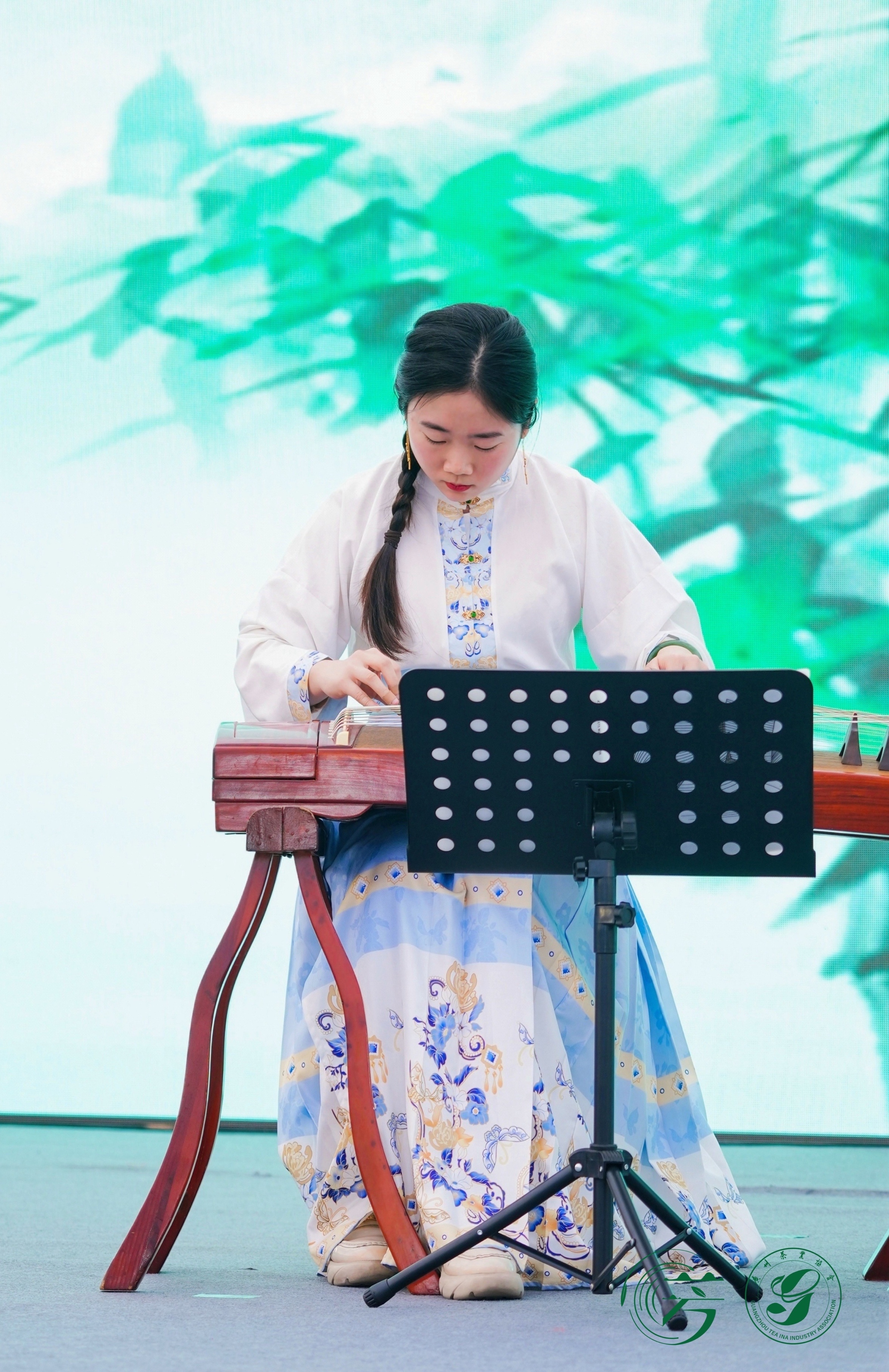 艺术与教育学院副院长李小燕带队,教师陈维璐与广东金砂茶园有限公司国家高级茶艺师黄源垚校企携手,以传承非物质文化遗产为主题,融合了非遗茶艺与古筝演奏,将丰富的文化体验带入社区。过程中,观众不仅欣赏到了古筝的悠扬音律,还品味到了精心选用的茶叶,为现场1500名观众奉献了一场别开生面的非遗文化视听盛宴。表演过程中选用的茶叶正是广东金砂茶园有限公司的特色产品“金砂红”, 金砂茶树是金砂茶园的创始人历经十年从一株百年古茶树培育引种成功出来,其茶汤金黄油亮,带肉桂香和玫瑰花香,香气高长持久且层次分明,滋味甜爽,口感饱满细腻,为现场观众增添了一层丰富的感官体验。