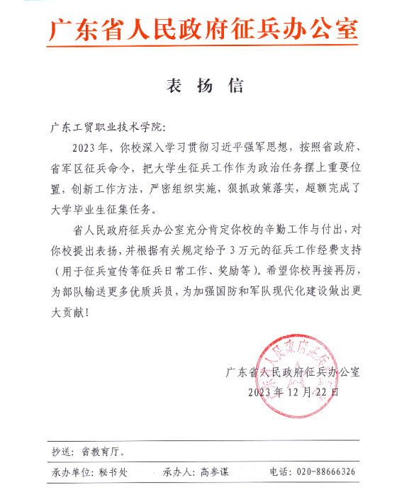 广东省教育厅、广东省人民政府征兵办公室表扬信