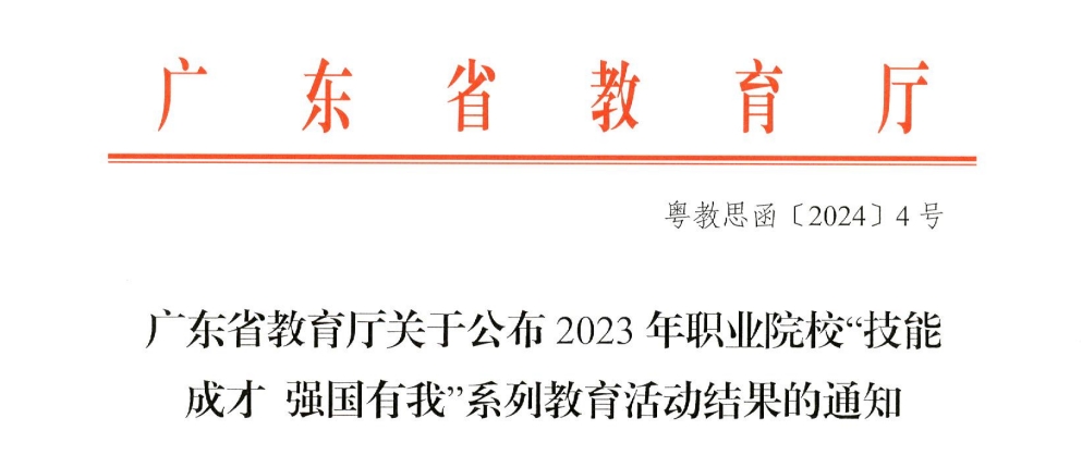 近日,广东省教育厅公布了2023年职业院校“技能成才 强国有我”系列教育活动评选结果。我校师生在学习党的二十大精神征文活动、“未来工匠”读书心得活动和“悦读伴我成长”读党报活动中作品分别获一等奖2项、二等奖2项、三等奖4项,由于组织工作突出,成绩显著,学校获评“优秀组织奖”,2项作品指导老师获优秀指导老师奖。具体获奖情况如下: