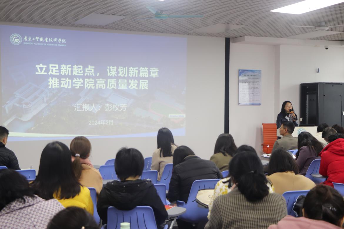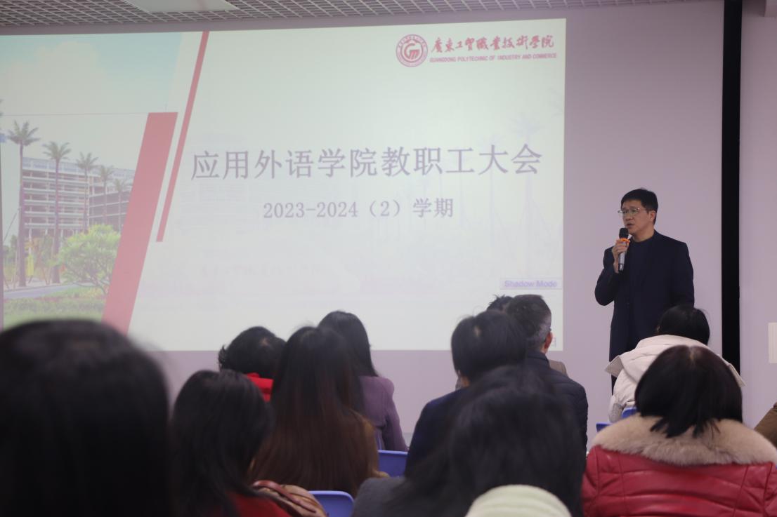 为扎实推进广东省高质量发展,实现新的跨越。2月29日应用外语学院在白云校区行知楼602召开全体教职工大会。学校党委委员、副校长刘贻新,应用外语学院院长彭枚芳,学院党总支临时负责人罗春科,学院副院长胡红玲,学院学工办主任林耀佳及全体教职工参加会议。本次会议由罗春科主持。