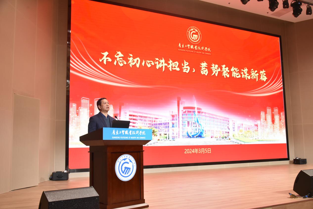 实干争春早,奋斗向未来。会上,何汉武作了“构筑支撑新质生产力发展人才底座 为助推广东高质量发展挺膺担当”的主题报告,总结了学校2023年取得的主要成绩,分析研判了新的机遇和挑战,围绕“八大工程、九大举措”明确了学校2024年的重点工作,从立德树人、人才培养、科教融汇、产教融合、国际合作、文化育人、校园安全等9个方面的工作目标和任务为学校2024年高质量发展指明方向和路径。龙腾四海皆春色,风好正是扬帆时。他勉励广大教师要坚定信心,拼搏奉献,在新的一年里,锚定高质量发展目标实现新的更大作为,力争在服务广东省高质量发展中作出更大贡献。