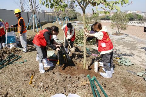 在植树活动中,老师、同学们热情洋溢、分组植树、扶苗填坑、提桶浇水,大家干劲十足,每个步骤有条不紊,在阳光下种下了一棵棵绿树。师生们种下的是一棵棵绿树,收获的却是一份份满足!此次植树活动不仅为学校周边的环境添了充满生机的绿色,同时也在师生们的心里种下了生态、环保的理念,更激发了师生们热爱自然、保护生态环境的热情!