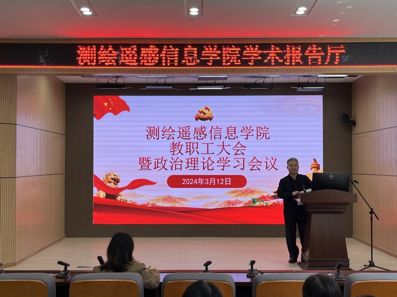 2024年3月12日下午,测绘遥感信息学院在白云校区图书信息楼测绘学术报告厅召开了教职工教职工大会暨政治理论学习会议。本次会议由测绘遥感信息学院党总支书记、院长速云中主持,党总支副书记李元以及测绘学院教职工参加了会议。