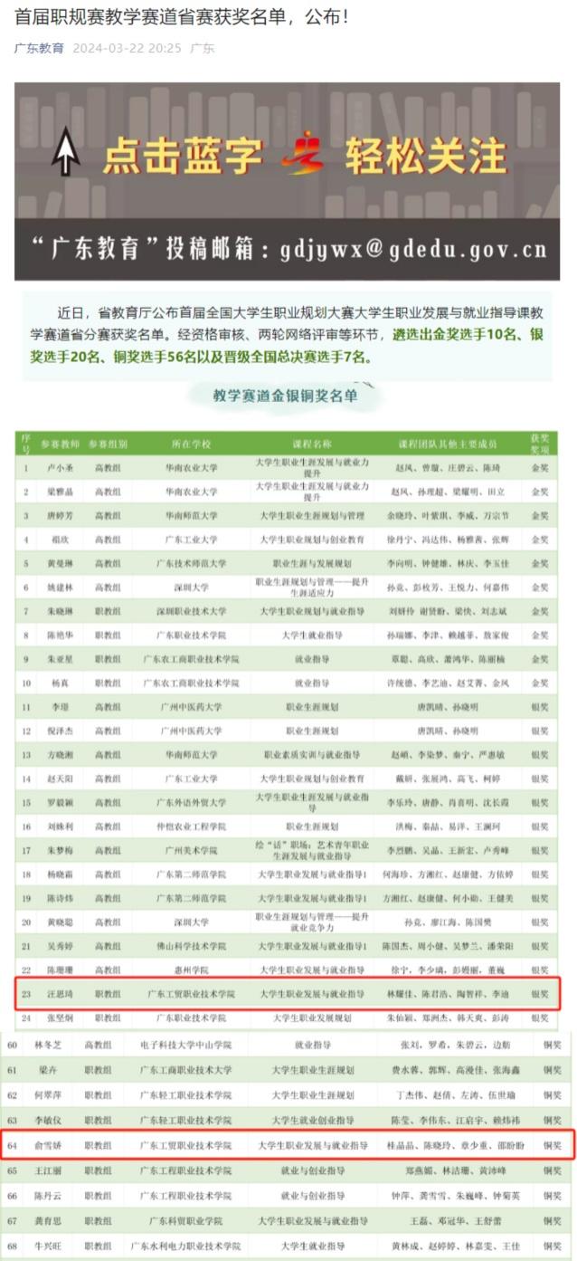 2024年2月至5月,教育部组织开展首届全国大学生职业规划大赛大学生职业发展与就业指导课程教学赛道赛事活动。根据教育部的统一部署,我校围绕落实立德树人根本任务、促进高质量充分就业,积极组织两个教师团队参加了首届全国大学生职业规划大赛大学生职业发展与就业指导课程教学赛道广东省分赛,和全省76支高职组队伍角逐,最终斩获一银一铜,为学校在首届全国大学生职业规划大赛广东省分赛中再添荣誉!其中,团队(汪思琦、林耀佳、陈君浩、陶智祥、李迪)获银奖(职教组第5);团队(俞雪娇、桂晶晶、陈晓玲、章少重、邵盼盼)获铜奖(职教组第16)。