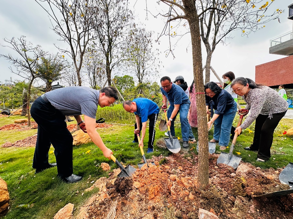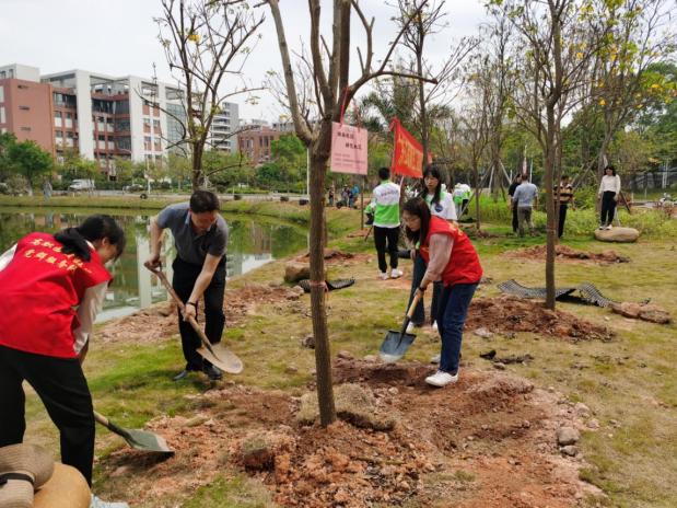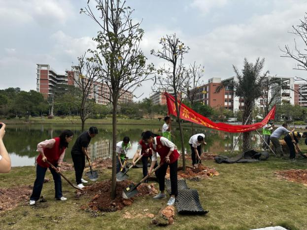 为深入贯彻落实习近平生态文明思想,筑牢树立和践行“绿水青山就是金山银山”的理念,助力推进绿美广东生态建设,3月29日下午,学校总务处、钟落潭镇高职园区社区和学校后勤服务企业在白云校区图书信息楼湖边草坪开展“后勤‘植’此青绿,助力绿美广东生态建设”义务植树活动。学校党委委员、副校长孙师家同志、总务处临时负责人曾庆生、钟落潭镇高职园区社区党支部冯晋碧书记、后勤服务企业代表和学校团委志愿者一起植下88株黄花风铃木树,为工贸校园再添新绿。