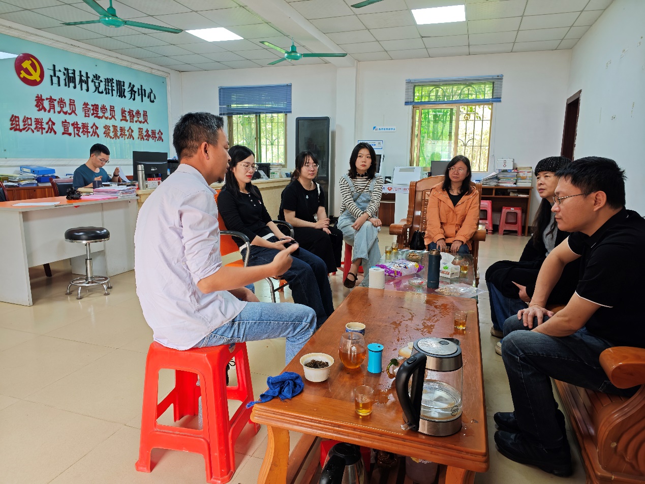 3月25日上午,张幼晖副院长一行首先来到了龙门县地派镇古洞村进行调研。古洞村地处地派镇东南部,地形地貌以山地为主,2017年发现村里有400多亩珍贵的野生古树茶群,这是世界上唯一不含咖啡碱的稀缺茶种,而且茶中富含的可可碱对降血压、强心、减肥有一定的效果。经过和村委书记潘嘉园的深入交谈,了解到2018年潘书记带头成立了龙门县潘嘉园茶业专业合作社,以茶产业为抓手,促进古洞村全面振兴,实现共同富裕。为了帮助古洞做大做强茶产业,助力乡村振兴,张院长团队与潘书记达成共识,可以发挥专业优势,把龙门非遗技艺“农民画”融入地派镇古洞可可茶的包装设计上,进一步提升古洞茶文化品牌。