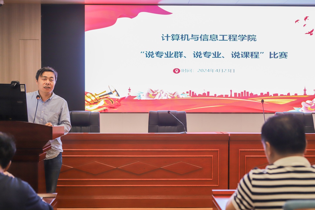 为促进计算机与信息工程学院专业(群)建设,推进课程改革,提高教师课程建设、教育教学等综合能力,提升人才培养质量, 4月23日下午,计算机学院开展了2024年度“说专业群、说专业、说课程”比赛,计算机学院院长余棉水、书记张宁担任评委组组长,副院长单家凌、副院长鲁庆、副书记张艳、各系主任及专业带头人为评委组成员,计算机学院全体教师现场观摩学习。