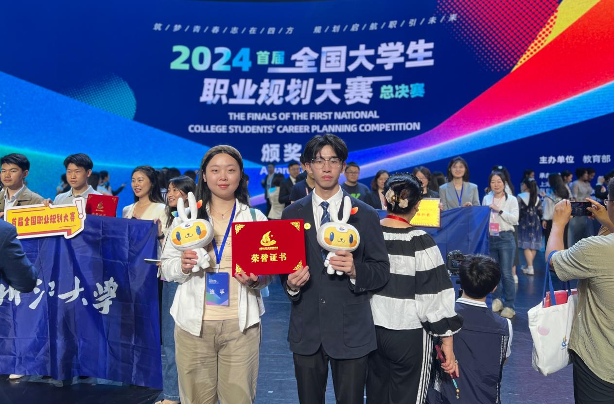 经过激烈角逐,全国600余名大学生晋级总决赛,决出金、银、铜、优秀奖。赵文伟和刘涵宇在全国总决赛现场凭借卓越的职业规划能力和出色的综合素质,脱颖而出,顺利通过主题陈述、评委提问和天降offer三个环节,充分展示了通过学习和实践,持续提升能力和素质,从而实现职业目标的成长过程。