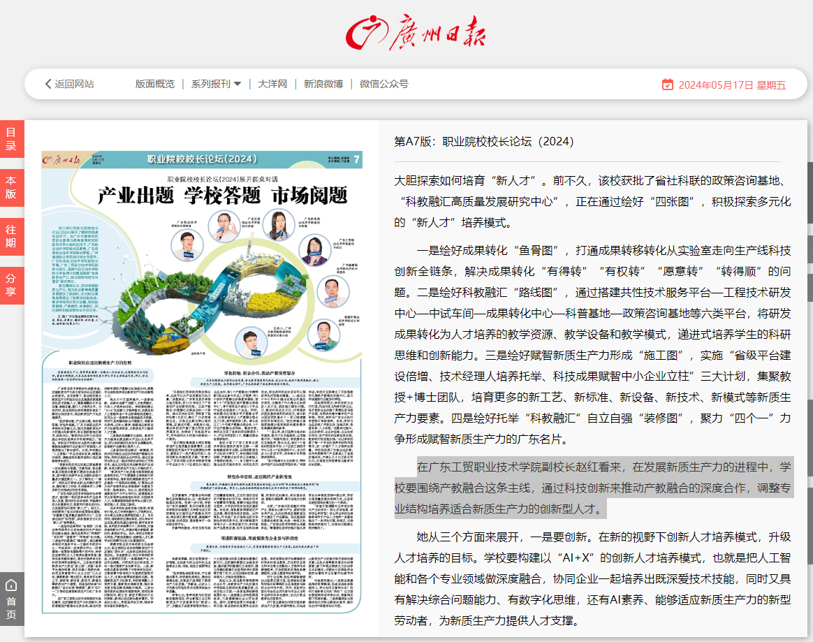 5月16日,职业院校校长论坛(2024)在广报中心举行。全省近70所高水平院校领军人物与专家、行业企业代表齐聚一堂,展开了精彩的圆桌对话,共话职业教育未来发展新蓝图,参与规模创下历届论坛新高。学校副校长赵红现场出席并作交流发言,会上颁发了2024高职院校(广东)科学研究20强和2024高职院校(广东)20强。
