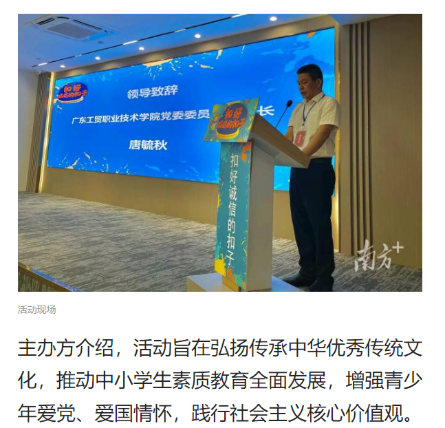 日前,广东省青少年“扣好诚信的扣子”主题书画活动在广州东莞庄举行。活动由广东省关心下一代工作委员会指导,广东省教育系统关心下一代工作委员会主办。学校党委委员、副校长唐毓秋出席会议并讲话,学生处副处长郭朝明获聘为活动组委会副秘书长及评委。