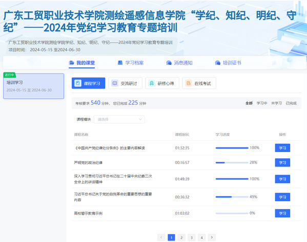 本次党纪学习教育专题培训通过测绘学院党建网络学习空间开展。测绘学院党建网络学习空间是依托学习公社,采用SaaS模式定制开发的党建专题网络培训平台,为党员提供在线学习和培训资源,有助于提高党员的思想政治素养。党建网络学习空间打破了时间空间限制,党员可以随时随地进行党性教育、法律法规学习和专题培训,破解了校外实习党员学生政治理论学习难的问题,将党建活动和形式多样的自主学习有效结合,实现学习的可跟踪、可量化、可考核。促进党建工作向更加智能化、灵活化的方向发展。