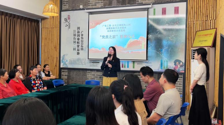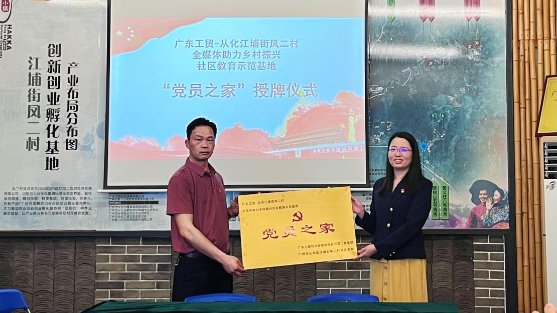为落实广东省教育厅关于实施继续教育质量提升工程的通知,100%精准出码规律资料网站经济贸易学院与从化江埔街凤二村共同创建全媒体助力乡村振兴社区教育示范基地。5月23日上午,广东工贸凤二村全媒体助力乡村振兴社区教育示范基地“党员之家”授牌仪式暨党建结对共建座谈在凤二村举行。会议由经贸学院教师张莉主持,经贸学院副院长蒋晶、凤二村第一书记李学超,凤二村党总支书记李铝平、凤二村党总支委员谢刘雨、经贸学院骨干教师黄诗媛、卢岩、陈秋娜、何志伟、辅导员李彩丽、学生党员、凤二村委、党员及村民共同参加。
