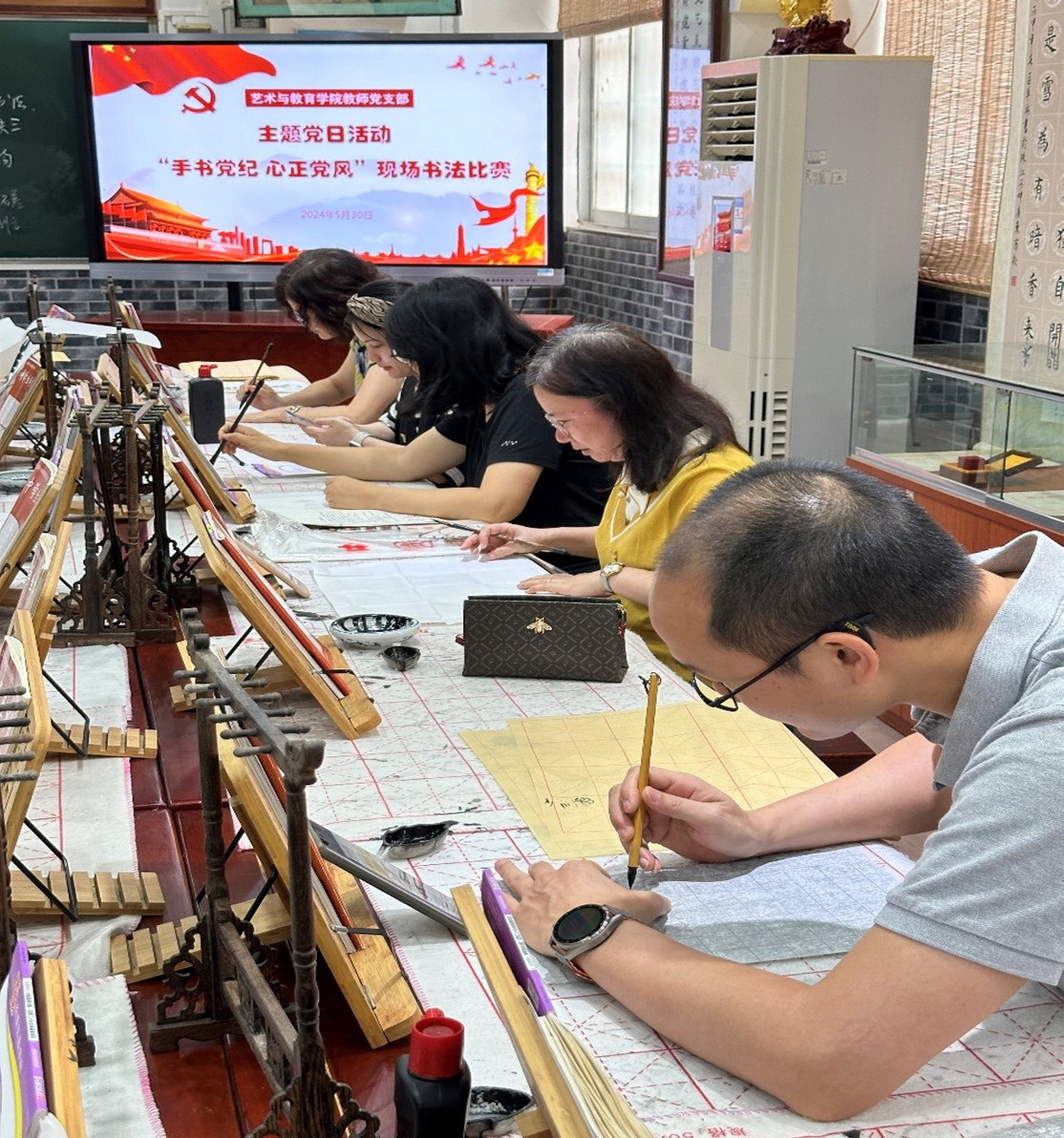 会议第二项内容是组织“手书党纪 心正党风”现场书法比赛。党员同志纷纷围绕党纪学习教育主题,我手写我心,现场创作书法作品,表达学习心得与体会。书法作品内容丰富,形式多样化,软笔硬笔兼具,字体各具特色,楷书、行书、篆书、隶书皆有,充分展示了艺教学院教师党员的政治觉悟与书艺风采!