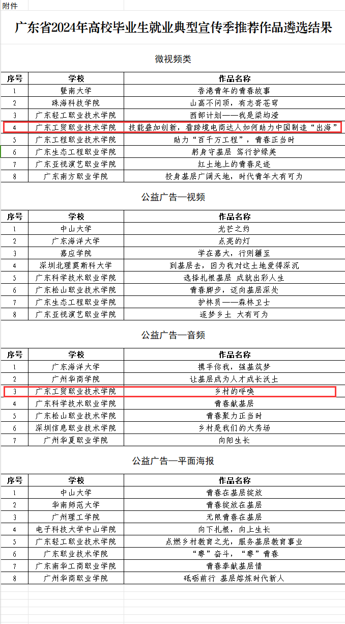 为配合广东省教育厅开展2024年高校毕业生就业典型宣传季活动,深入挖掘推广先进经验做法,发挥示范带头作用,营造促就业浓厚氛围,着力提升就业育人质效,提高就业服务水平,我校根据省教育厅文件精神积极报送“寻找宝藏毕业生”微视频和“无限青春在基层”公益广告作品,经过广东省教育厅学生就业创业处遴选,最终选出31个推荐作品,报送教育部参加全国层面的遴选展播。我校应用外语学院微视频《技能叠加创新,看跨境电商达人如何助力中国制造“出海”》(指导教师:林耀佳、苏俊懿 团队成员:贺樟媛、许晋嘉、余彦琳、谭颖恒、袁佳丽)和经济贸易学院音频公益广告《乡村的呼唤》(指导教师:莫雯嘉 团队成员:叶伟立、吴琼、李汇文)脱颖而出位列其中!