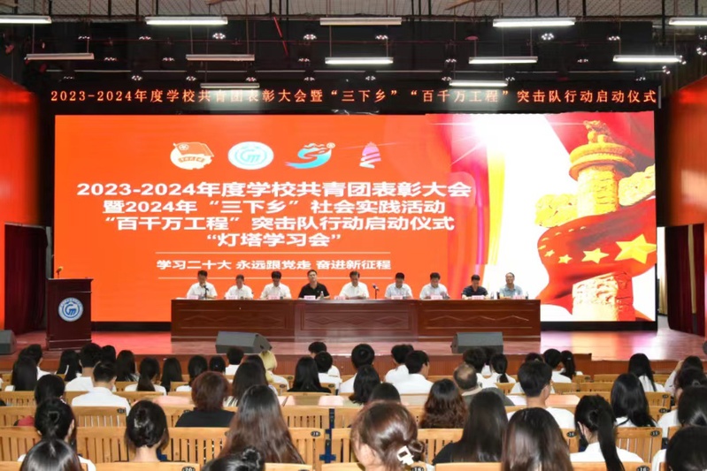 6月25日上午,学校在白云校区明德楼2-105演艺厅召开2023-2024年度学校共青团表彰大会暨“百千万工程”突击队行动及“三下乡”社会实践活动启动仪式、“灯塔学习会”,学校党委书记何汉武、党委委员、副校长唐毓秋和党委办公室(与宣传部合署)、党委组织统战部、学校办公室、教务处、学生处、工会、团委负责人,以及二级学院书记、副书记、分团委书记、辅导员、获奖师生代表等共约450人现场参加,另有约500名天河校区、荔湾校区、各分教点师生代表通过在线方式在分会场参加。