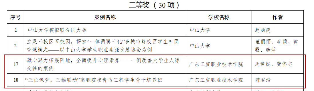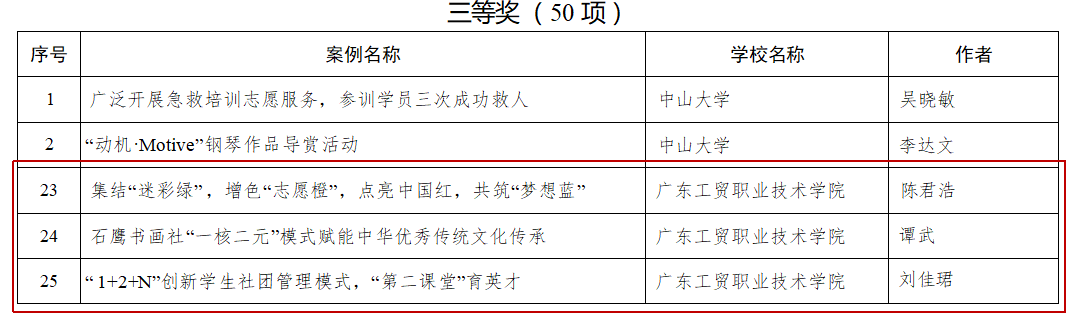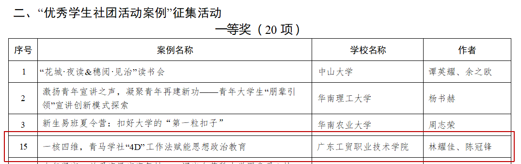 经过全体师生的共同努力,由陶智祥、李波指导申报的电子商务协会获评“优秀学生社团”(全省共10个,高职院校仅有两个),林耀佳、陈冠锋主笔的“一核四维,青马学社‘4D’工作法赋能思想政治教育”获评“优秀学生社团活动案例”一等奖(全省共20项,高职院校仅6项),科技创新社、军事爱好者协会获评“优秀学生社团”入围奖,还有两个案例获得二等奖,三个案例获得三等奖。