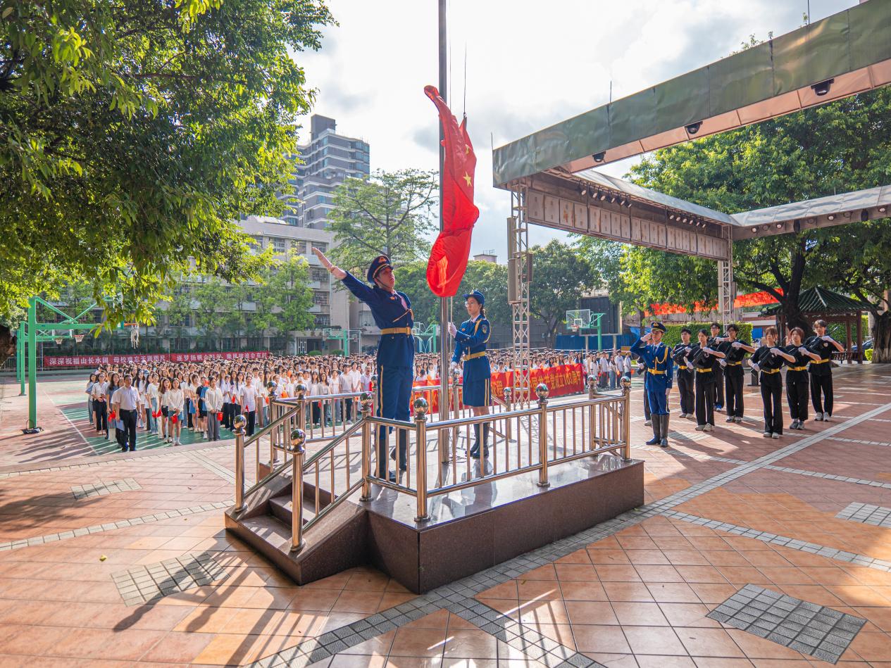 清晨时分,太阳初升,晨光微熹。在全体师生的注目礼下,在激昂的《义勇军进行曲》中,鲜艳的五星红旗迎着初升的太阳徐徐展开、迎风飘扬。