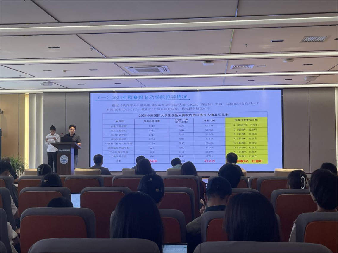 2024年7月4日,阳光明媚,春风和煦,我校在博学楼629举办了“2024中国国际大学生创新大赛推荐省赛项目训练营”的启动仪式。此次活动旨在进一步激发我校学子的创新潜能,提升项目质量,为即将到来的省赛做好充分准备。参加此次活动的领导嘉宾有学校党委委员、副校长唐毓秋,学生工作部部长刘建军,团委书记陈冠锋,创新创业学院常务副院长侯勇强,团委副书记唐建树,创新创业学院副院长王坤明,以及各二级学院分管创新创业工作的领导、老师和获得校赛金银奖项目组的成员。