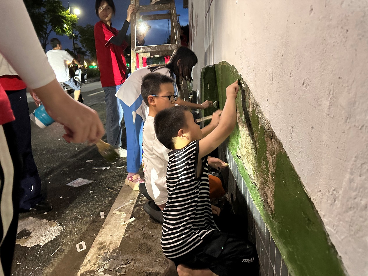 时间悄然流逝,转眼间已至夜幕降临。但红星突击队的队员们并未因此放慢脚步,他们依然坚守岗位,用画笔继续绘制着南溪村的红色记忆。在灯光的映照下,他们的身影显得格外坚定和执着。与此同时,队员们忙碌的身影也吸引着在附近嬉戏的小朋友。看着队员们拿着画笔涂鸦,小朋友们也带着纯真的笑容和无限的创意,与突击队的队员们一起为墙面涂色。他们的小手虽然稚嫩,但每一笔都充满了对美的追求和对家乡的热爱。
